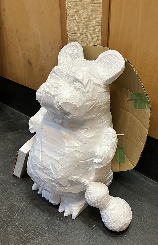 信楽焼のお狸さん 2025年11月15日 / シガ防虫 を作ります。といっても焼き物は敷居が高いのでFRPでチャレンジだ。 まずはラフスケッチ。 こんな感じ。 次は発泡スチロールを貼ったり切ったりしながら原型を作ります。 我が家の愛犬ブル太の写真を見ながら作ったらブル太の顔になってしまった。熱線で切る発泡スチロール用カッターを使うんですが、油断すると切れすぎてしまうのでわりと難しいです。でもサクサク切れるので楽しい!