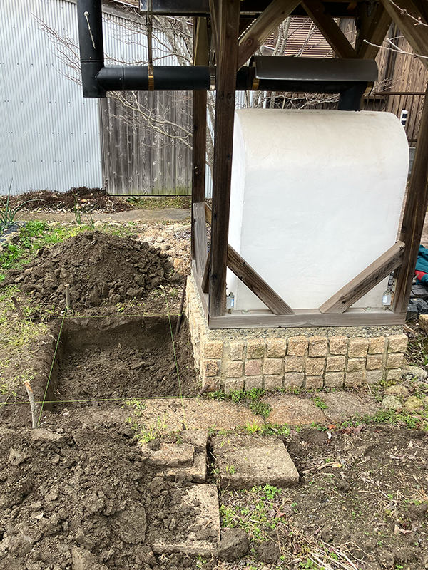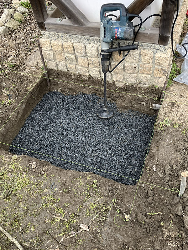 型枠の中にコンクリートを流し込んで、簡易バイブレーター(写真の上にあるドリルみたいなの)をかけます。